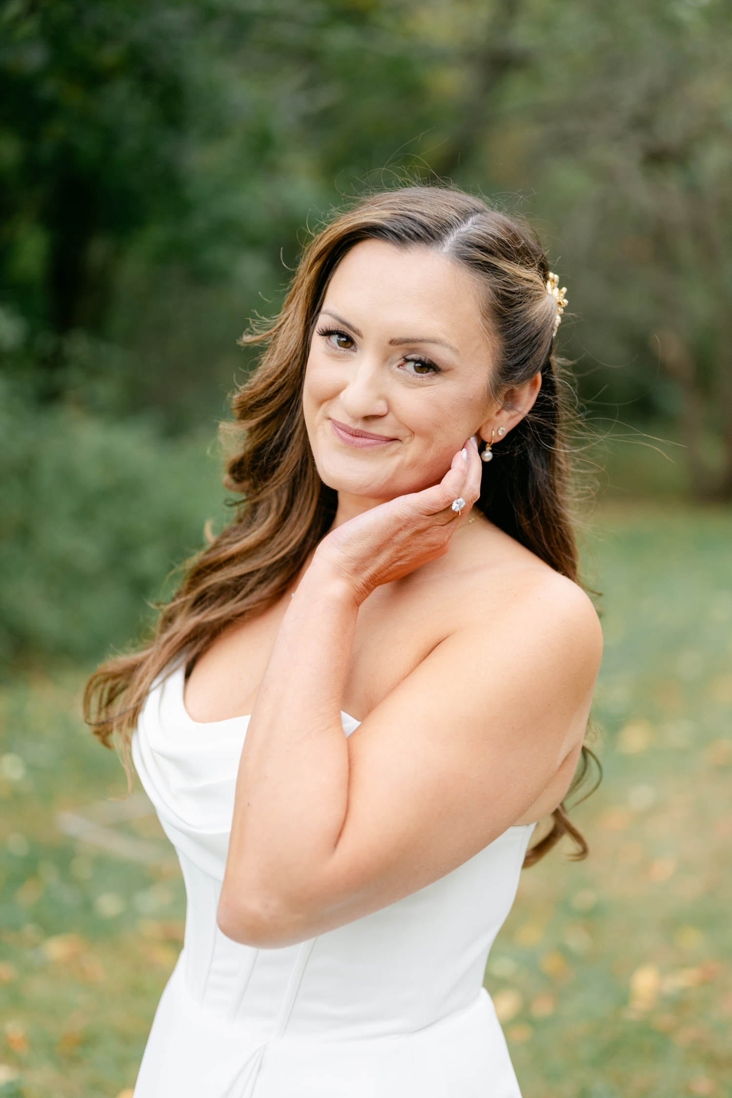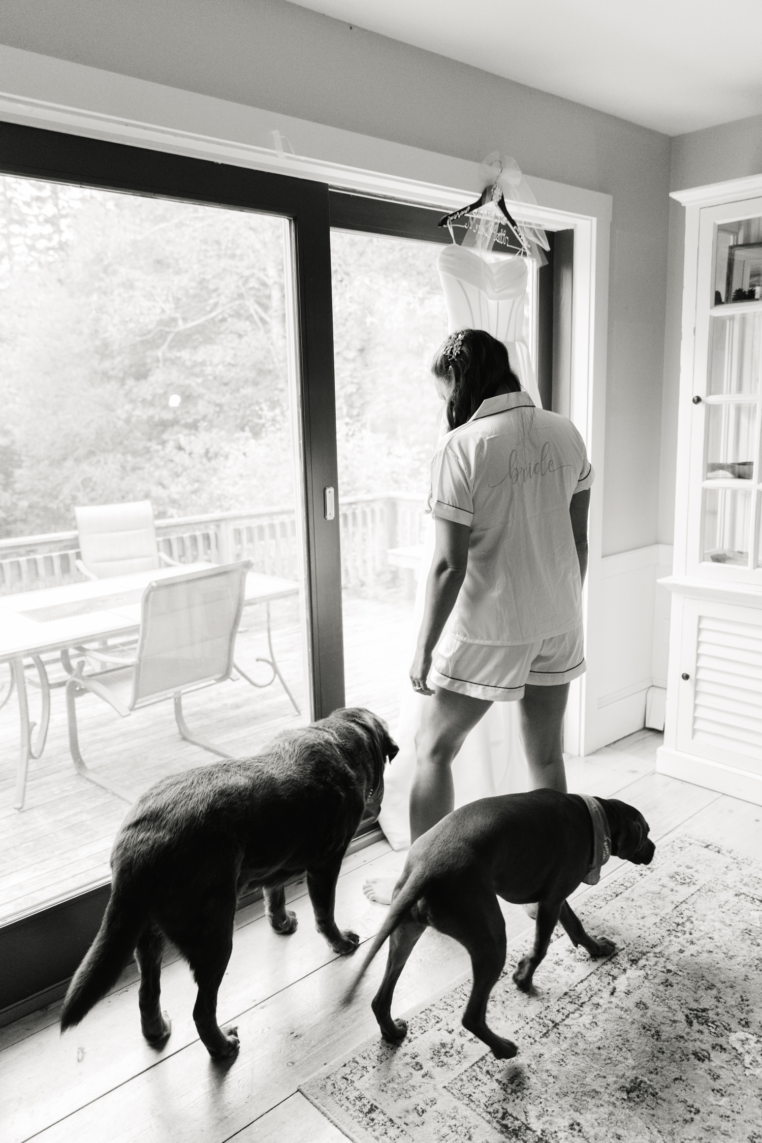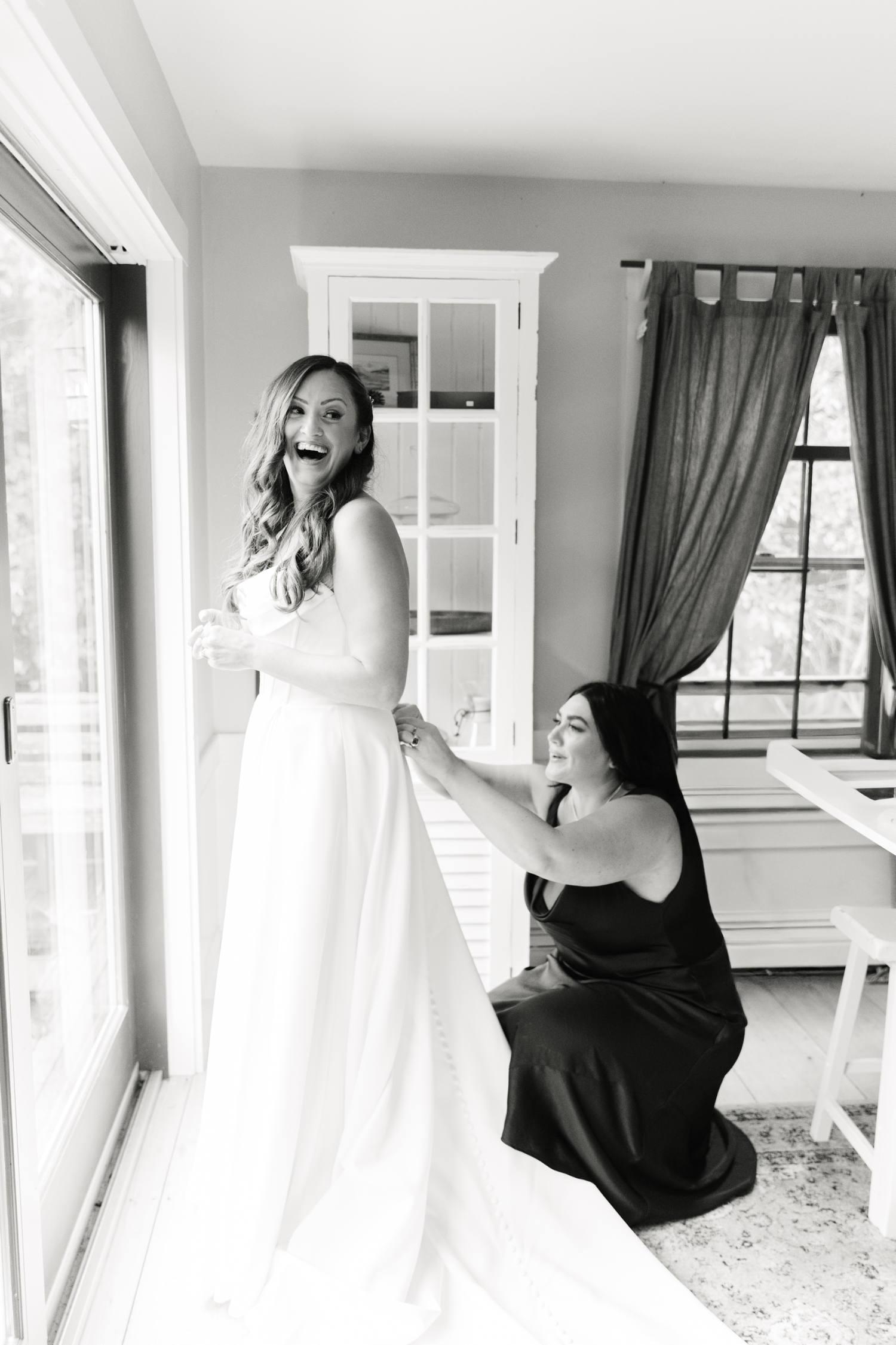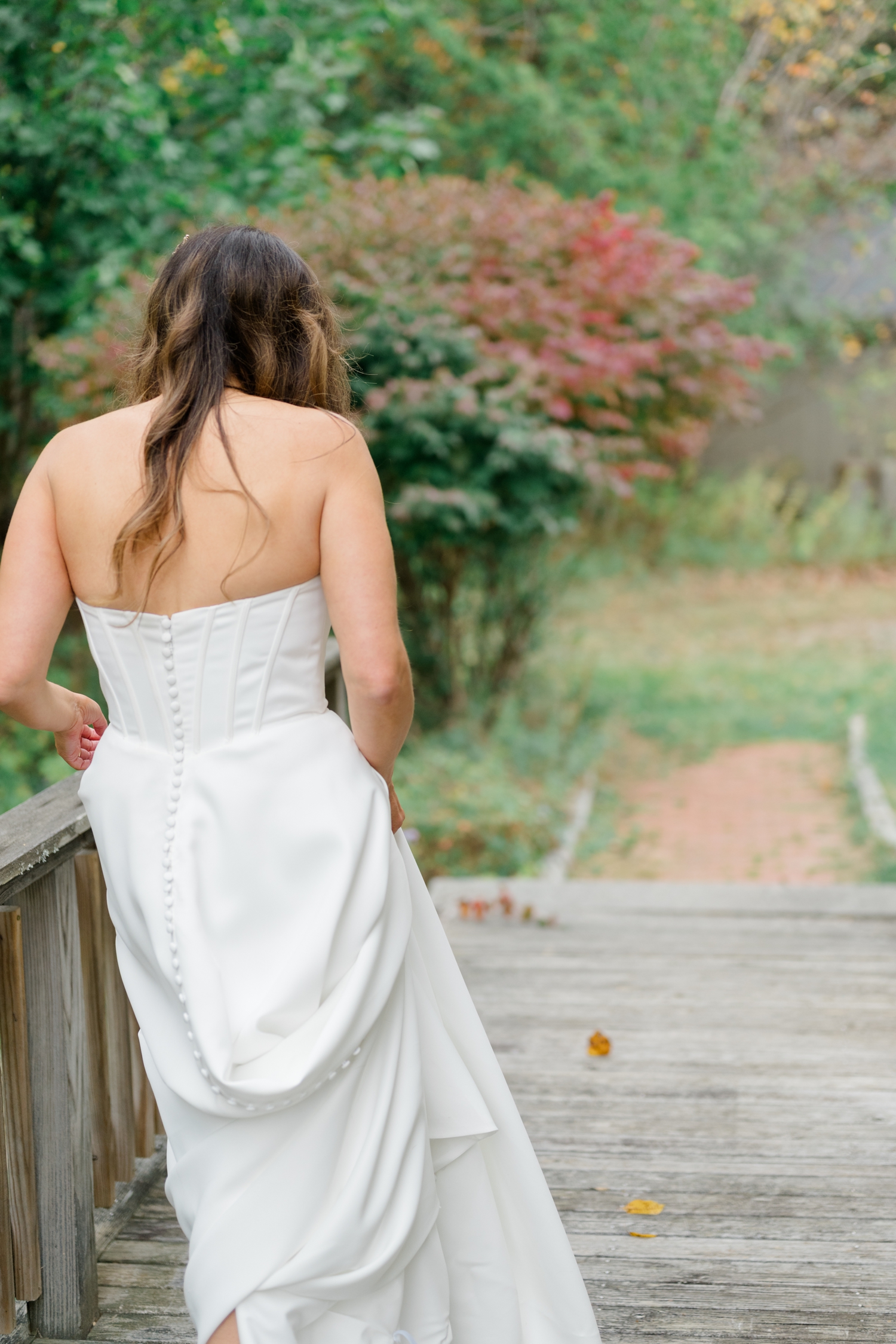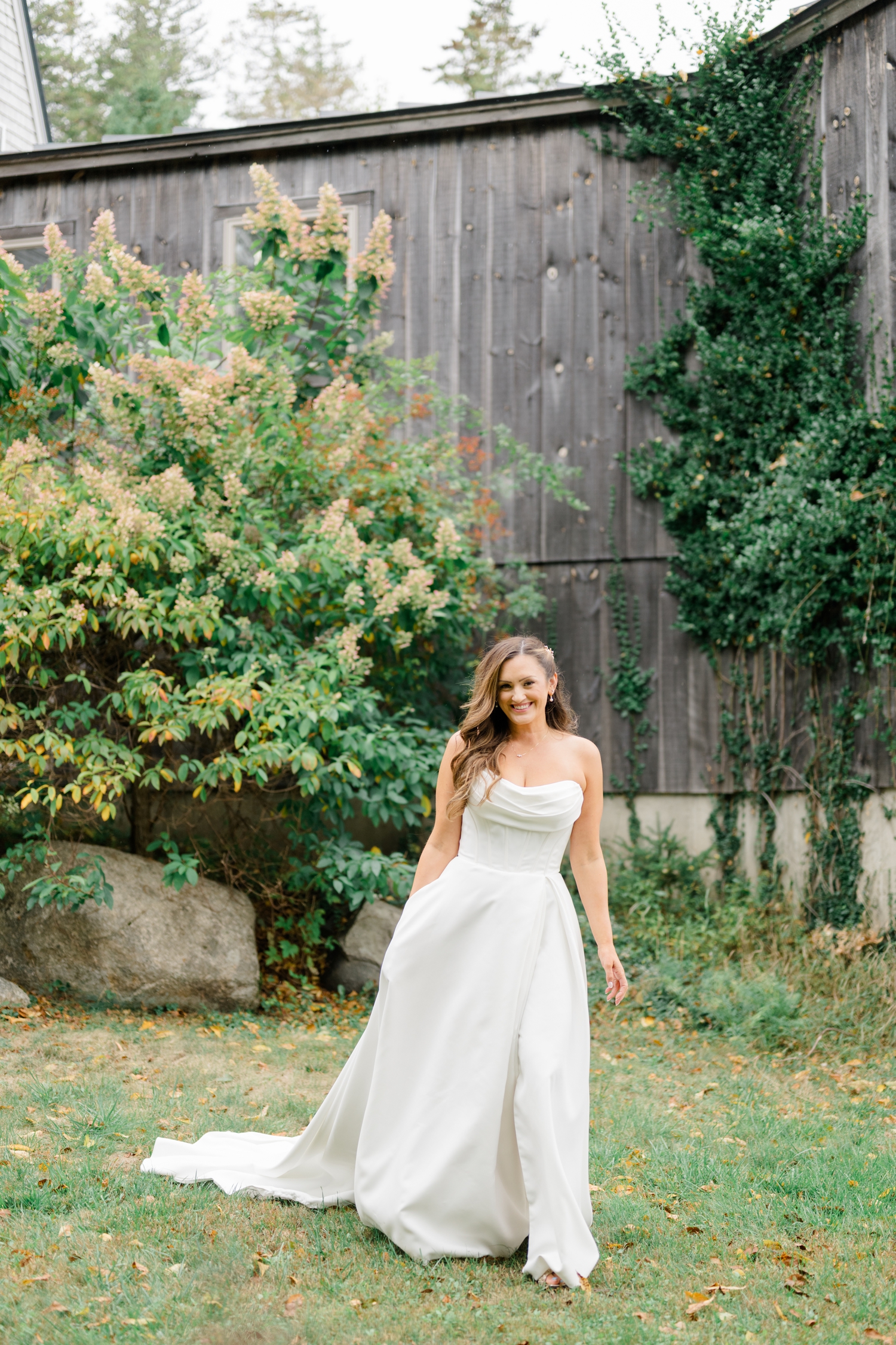 Jen spent her slow morning tucked into the peaceful grounds of the AirBnb the couple rented for their whole family to spend together over the entire weekend. Wrapped in the soft fall air and surrounded by Maine’s colorful foliage, Jen’s strapless gown moved beautifully as she stepped across the lawn. The fabric caught every bit of soft morning light.