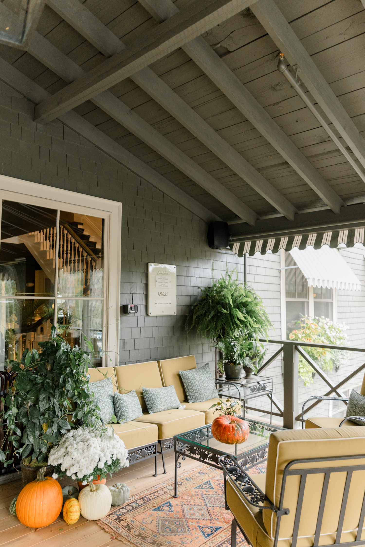 One of my favorite moments was Jen and Pat stepping outside to greet their vintage cream-colored convertible. It sat just in front of the inn, its curved frame and polished chrome shining against the soft gray exterior of the hotel. The car felt like a natural extension of their style — timeless, a little playful, and completely fitting for the historic feel of Northeast Harbor. Jen’s white faux-fur coat only added to the vintage sophistication of the moment.