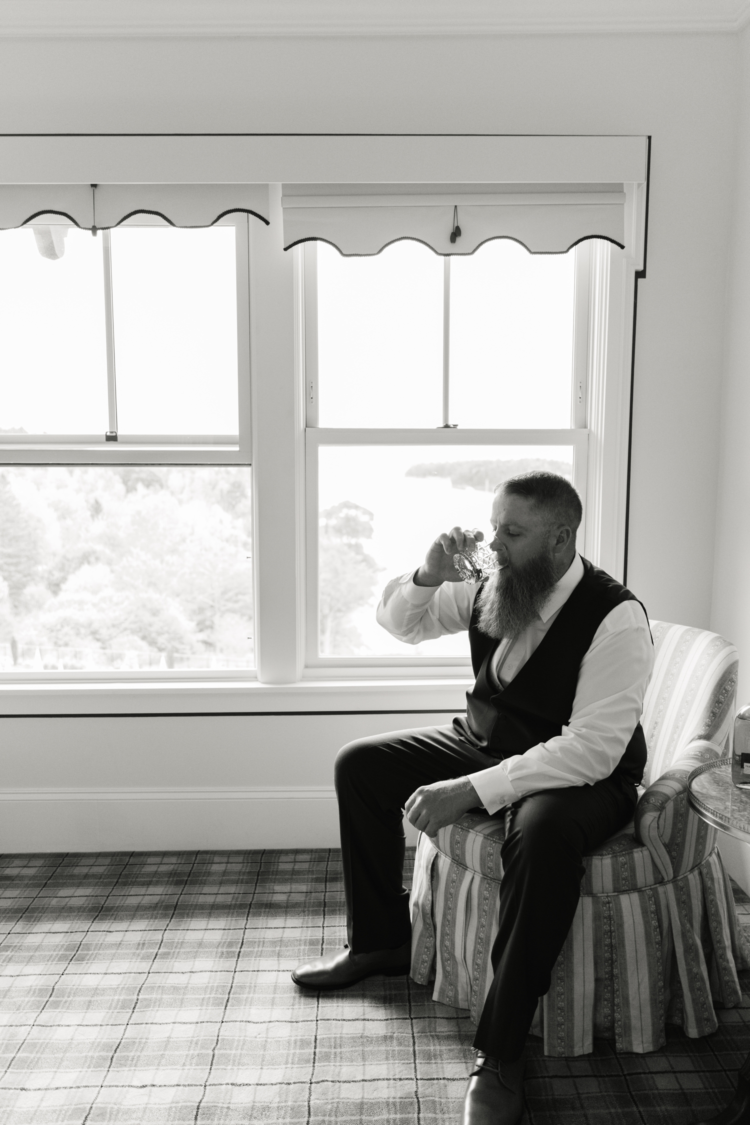 We originally planned to go to a few locations in Acadia National Park for their portraits before the ceremony. But after seeing all of the beautiful portrait opportunities at The Asticou, and knowing how busy Acadia was since it was peak October foliage time, I helped Jen & Pat pivot slightly and we decided to skip that idea. Instead of cramming so many things into their timeline and bopping around, they stayed in the Asticou bar lounge to spend some quiet, quality time together and sip on espresso martinis. To be honest, I’m so glad everything worked out this way because it was so much more aligned with them and their laid-back style. Plus, the pictures did not disappoint!