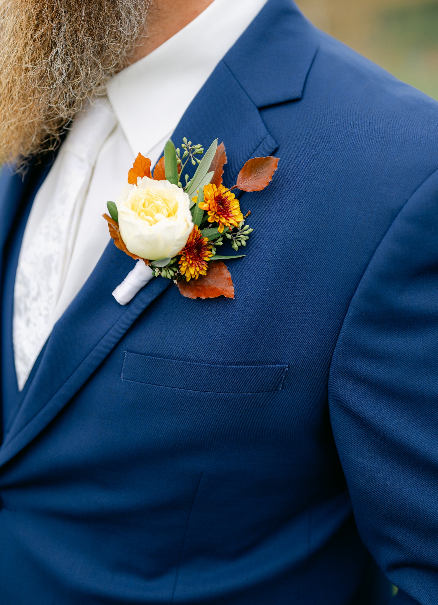Jen’s white coat moved softly in the wind as she walked toward their small group of guests. The ocean surf crashed into the rocks in the distance to add a dramatic effect. Pat waited for her in a deep blue suit that echoed the tones of the water behind him. His colors paired beautifully with Jen’s bouquet — a lush arrangement of red, burgundy, citrus-toned blooms, and coastal greenery. The florals brought warmth to the cool landscape and tied the day together with an earthy elegance.