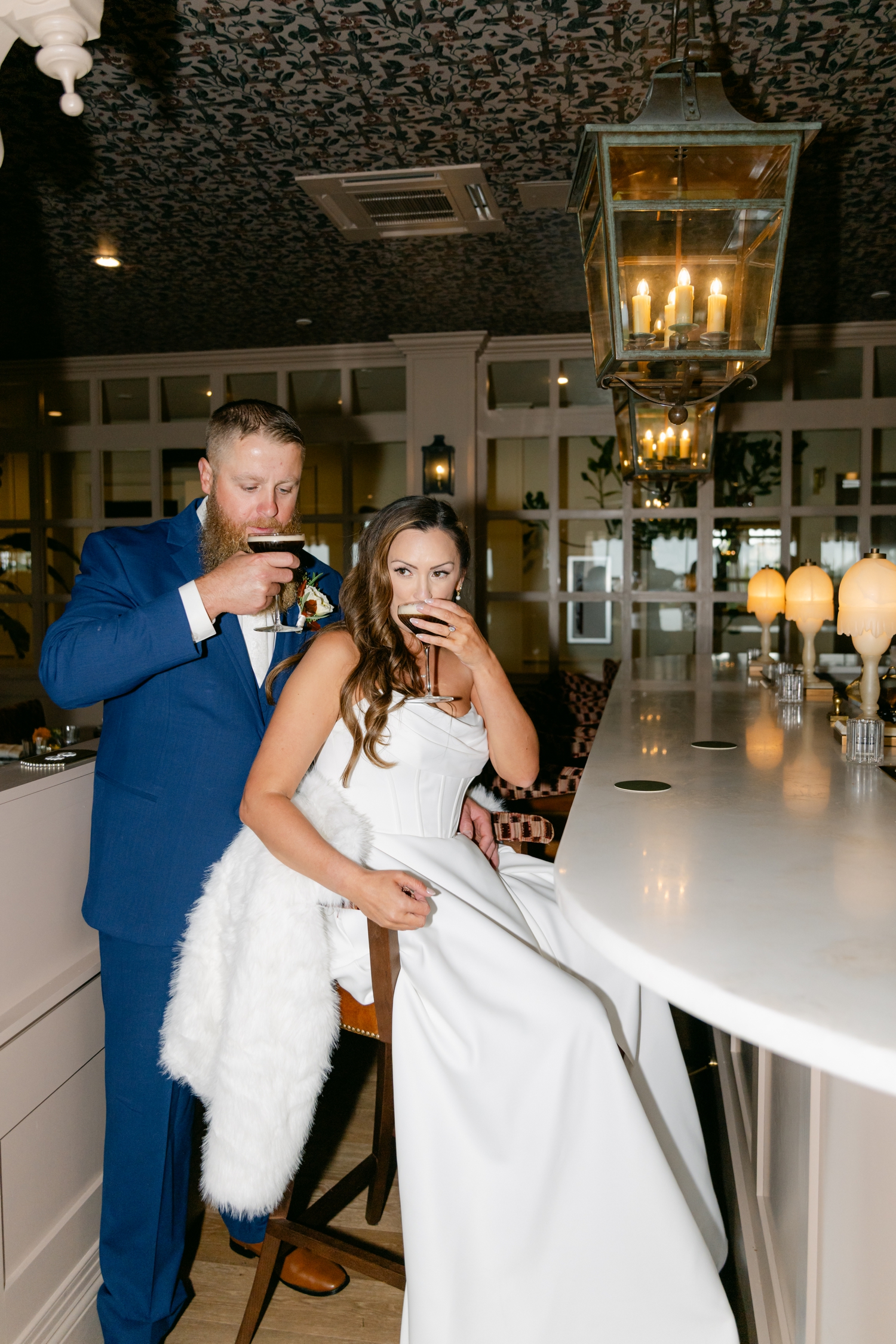 Inside, the Asticou Hotel bar and dining areas glowed with soft light. Jen and Pat slipped into the bar for a toast — one of my favorite images from their day. Jen sat at the counter in her gown, glowing and relaxed. Pat stood beside her, espresso martini in hand, with the kind of playful confidence that comes from years of comfort together. The bar’s lantern-style lighting and patterned ceiling added rich texture to the moment.