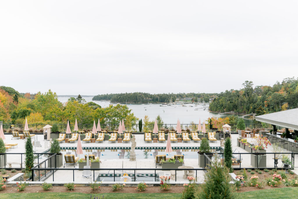Outside, autumn draped the property in rich color. The trees framed the luxury cabins, the tranquil pool, and the lush gardens that open toward Northeast Harbor—where private boat charters glide out toward Acadia. With all of this as their backdrop, the groom waited for his bride for their first look, surrounded by the kind of natural beauty that makes moments feel even more meaningful.